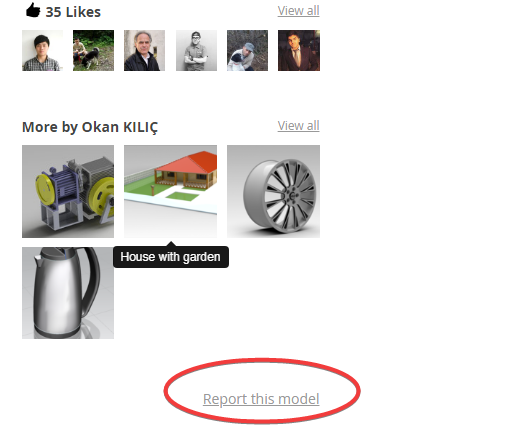 If you see your models posted by someone else on GrabCAD without attribution, please report it to us and refrain from posting comments on the model. You can 'Report' a model by using the the ‘Report this model’ button found on the bottom right side of the page under ‘Similar models’.
