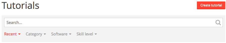 - Use our search function to see if your tutorial topic has already been covered. Filter your search with the drop down features by category, software, and skill level. If your tutorial hasn't been created yet, click the red ' Create Tutorial' button seen below.