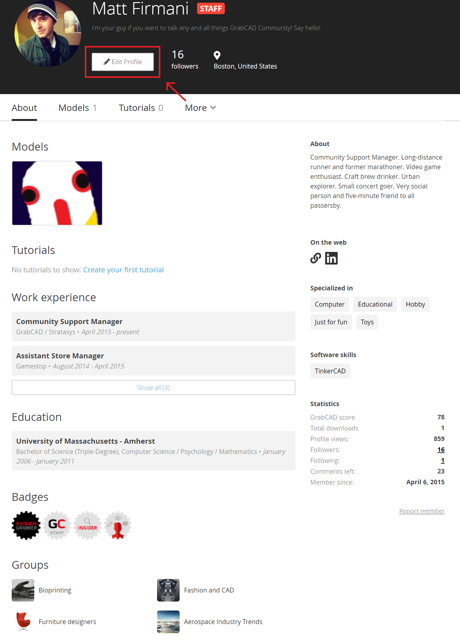 This will bring you to your public profile page. This is what our other members see when they click on your name on a model page, tutorial, question, comment or group discussion thread. To make changes, just click the "Edit Profile" button, located beneath your name.