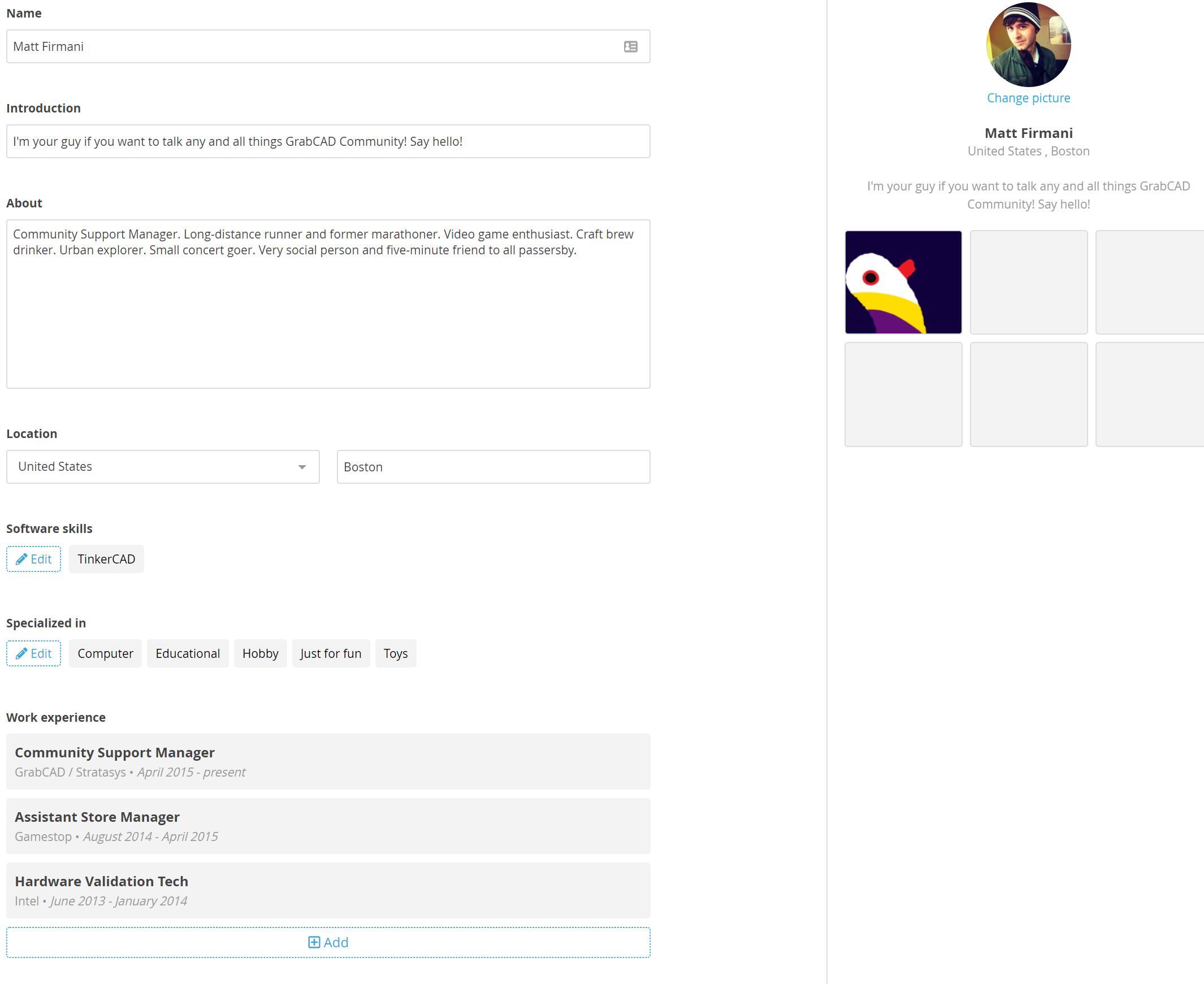 Your GrabCAD profile is your opportunity to tell the CAD world what you're all about! It's the place to go to browse through all of your content (models, tutorials, group memberships, badges and account statistics). It's also a place where you can showcase your work and educational experience, and direct our members to your social media accounts and personal websites. But how do you make changes and add information to your profile? Let's take a look.