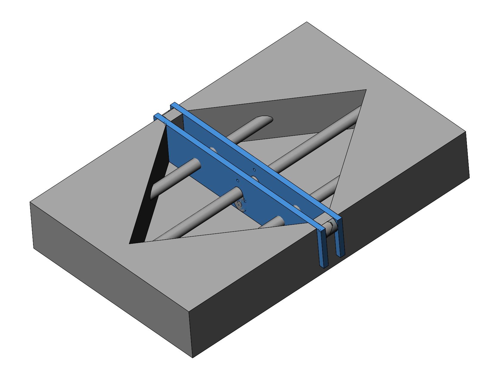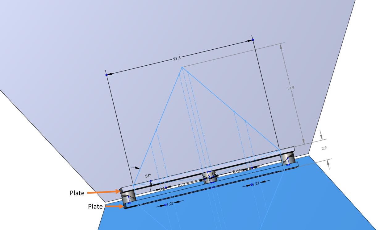 The mechanism should fit in the volume illustrated above, with each side of the latching mechanism fitting in an isosceles triangle extending from the plate that is 20.6cm (8.5”) wide by 14.9cm (5.9”) tall, with an out of plane depth of 5 cm (2”). This includes the latch and any actuators, springs, or power storage systems to actuate the latch. It also must not interfere with cylinders running through the triangle. During operation, the latching mechanism is allowed to expand beyond the 5cm depth constraint.