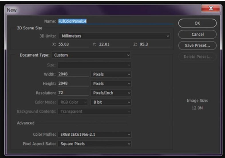 Drag and drop the 3D file into Photoshop. In the new file dialog, set the file, 3D unit and document size.