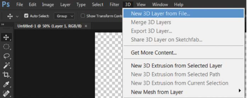 With a Photoshop document open, go to the 3D menu and click on “New 3D Layer from File.”