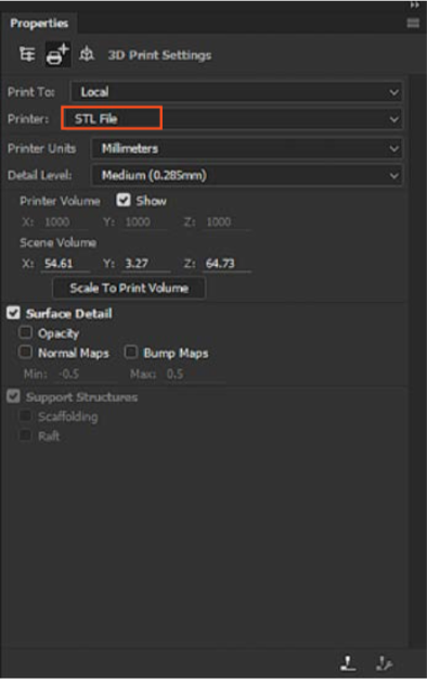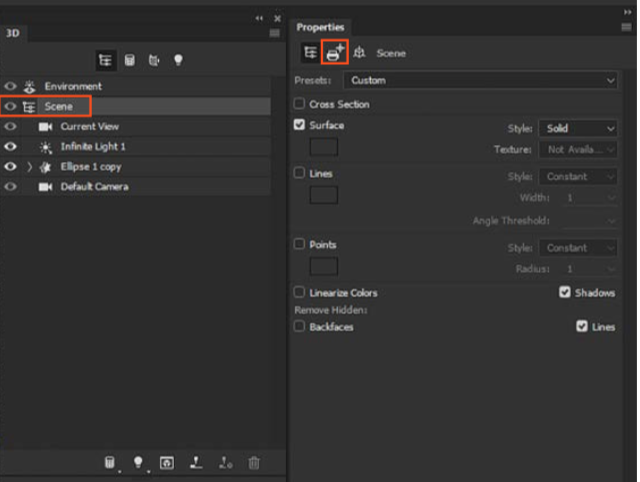 Step B: Or from the 3D tab, select “Scene.” Under “Properties” select the printer icon.