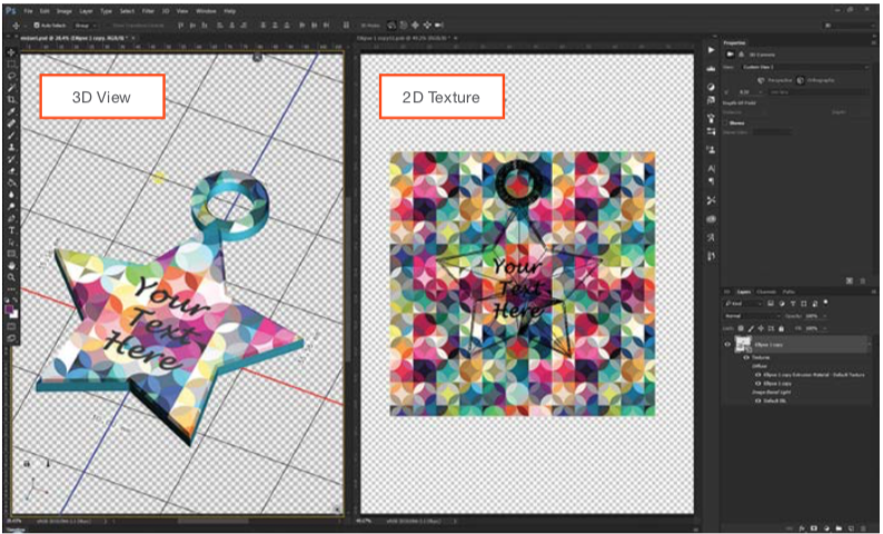 To 3D print objects with colorful, complex graphics and gradients, you’ll need access to a Stratasys J750TM 3D Printer. With Photoshop you can easily add color and graphics to you model and export as a .VRML file with all the color information.